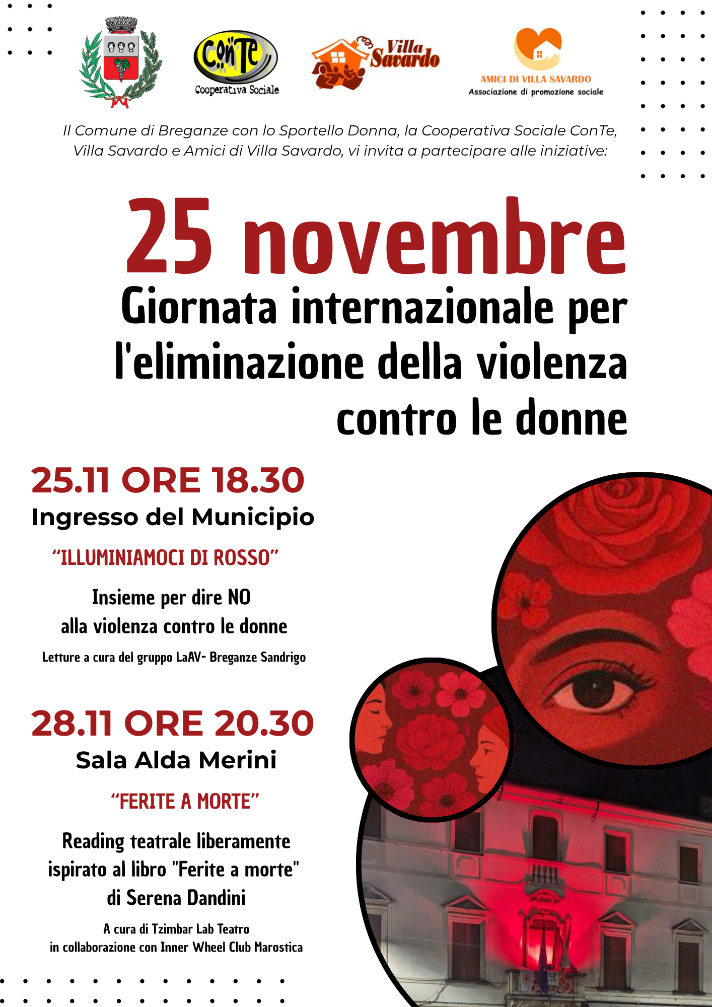 In occasione della Giornata Internazionale contro la violenza sulle donne, il Comune di Breganze con lo Sportello Donna, la Cooperativa Sociale ConTe, Villa Savardo e l'associazione Amici di Villa Savardo, organizza: