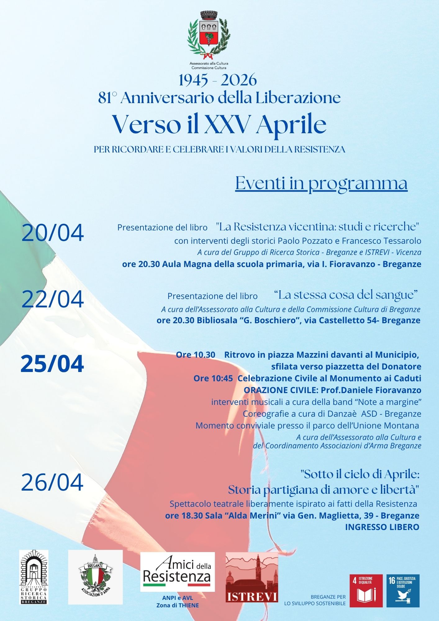 25/04: ore 10:30 ritrovo in Piazza Mazzini davanti al Municipio, sfilata verso Piazza del Donatore - ore 10:45 Celebrazione Civile al Monumento ai caduti. ORAZIONECIVILE: Prof. Daniele Fioravanzo. Interventi musicali a cura della band "Note a Margine", coreografie a cura di Danzaè ASD Breganze - Momento conviviale presso il parco dell'Unione Montana - a cura dell'Assessorato alla Cultura e del Coordinamento Associazioni d'Arma Breganze