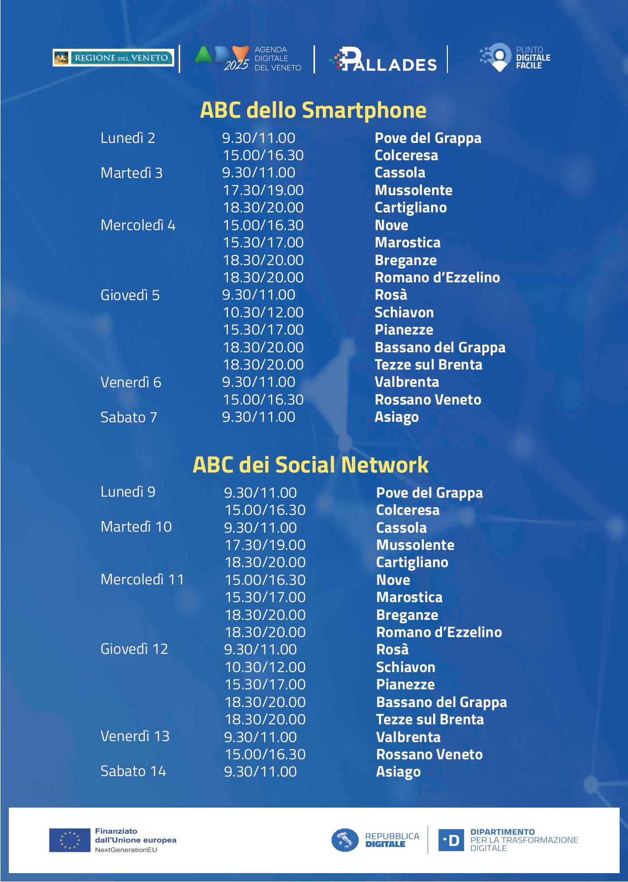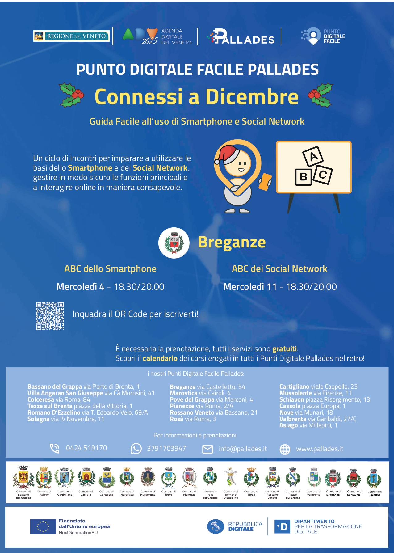 Nell'ambito del progetto generale PALLADES di avvicinamento della cittadinanza all'uso consapevole e informato del digitale, viene offerto un incontro per imparare a conoscere e utilizzare i principali Social Network, gestendo in modo sicuro e consapevole le funzioni principali di questi strumenti.
