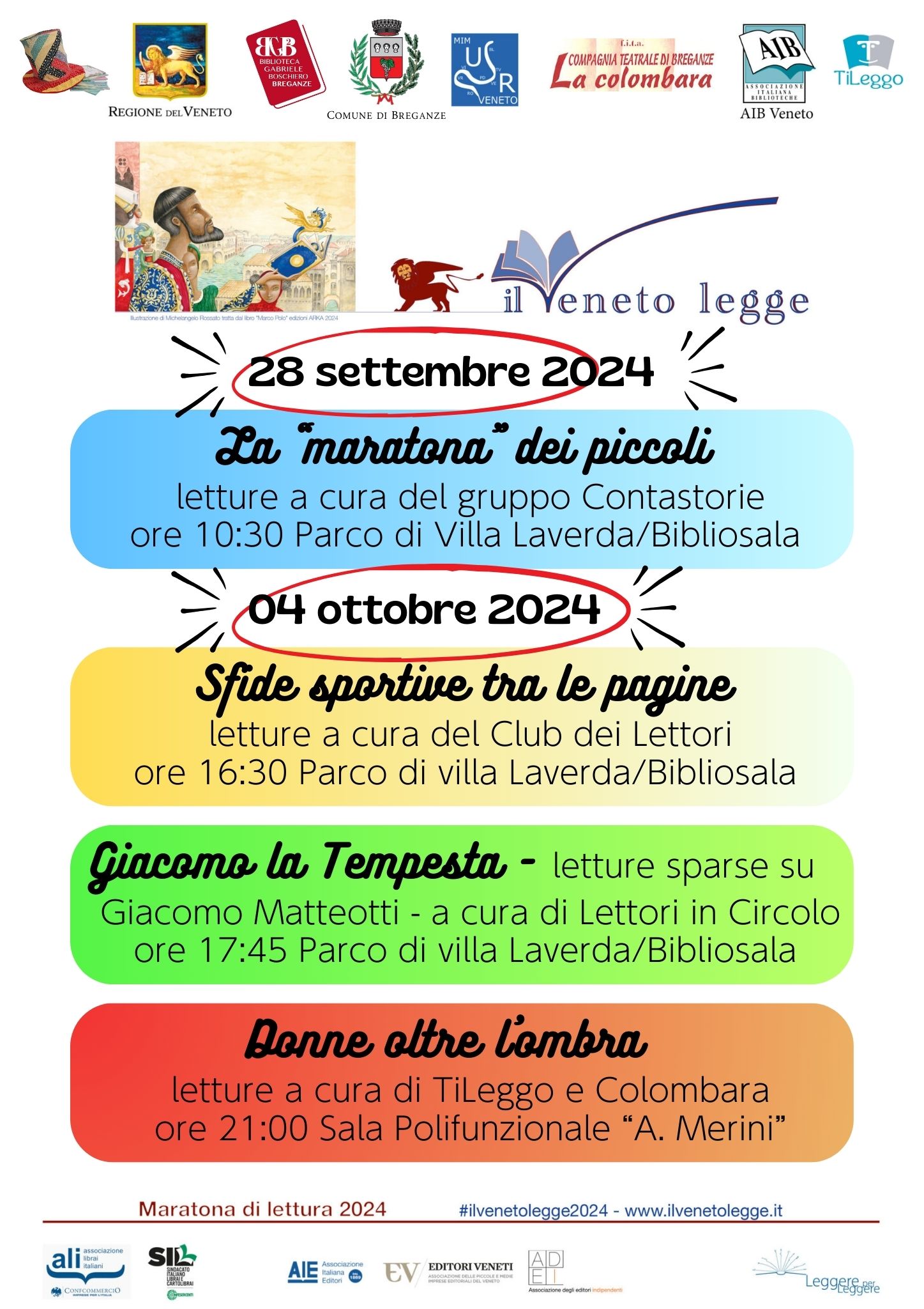 Tradizionale Maratona di lettura promossa dalla Regione attraverso una "staffetta" di lettura che inizierà il giorno 28 settembre per i più piccoli e le letture animate dal Gruppo Contastorie, per conlcudersi poi con il giorno della Maratona, 4 ottobre, con letture in Biblioteca/Parco di Villa Laverda con il Club dei Giovani Lettori, i Lettori in Circolo e serata finale in Sala Polifunzionale con Ti Leggo e Colombara.